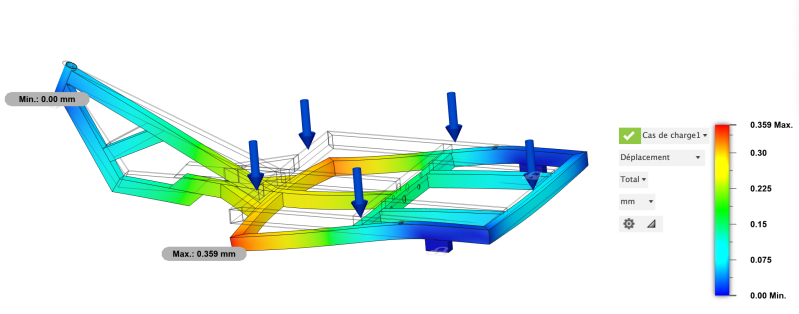 Étude de comportement mécanique d’un châssis soumis à différentes charges. Cette simulation permet d’évaluer les déformations et déplacements sous contrainte afin d’optimiser la conception et garantir la résistance structurelle. Un projet illustrant l’importance de la validation numérique pour assurer la fiabilité des structures mécaniques.
